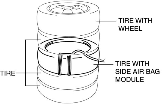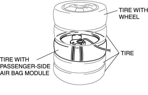 5. Stack the tire with the passenger-side air bag module on top of two tires without wheels. Stack a tire without a wheel on top of the tire with the passenger-side air bag module, and then stack another tire with a wheel on the very top.