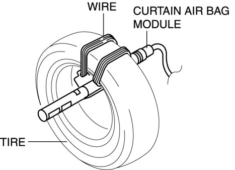 3. Secure the curtain air bag module to the tire, by wrapping a wire (cross section 1.25 mm2 {0.002 in2} or more) through the tire and the bolt installation holes at least 4 times as shown in the figure.