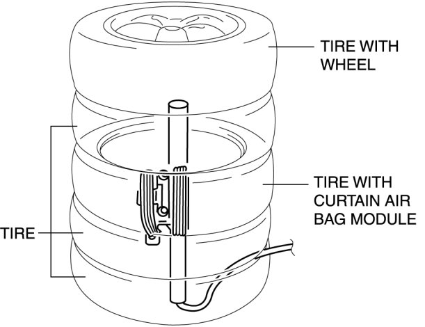 5. Stack the tire with the curtain air bag module on top of two tires without wheels. Stack a tire without a wheel on top of the tire with the curtain air bag module, and then stack another tire with a wheel on the very top.