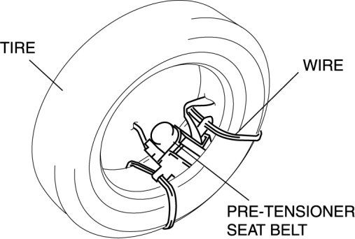 3. Put the pre-tensioner seat belt inside the tire and secure it to the tire by wrapping a wire (cross section 1.25 mm2 {0.002 in2} or more) through the tire and the bolt installation holes at least 4 times.