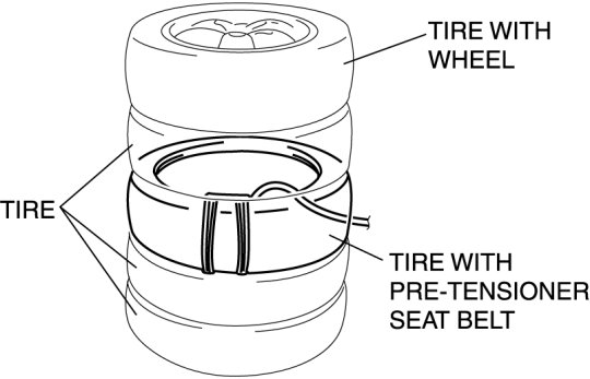 4. Stack the tire with the pre-tensioner seat belt on top of two tires without wheels. Stack a tire without a wheel on top of the tire with the pre-tensioner seat belt, and then stack another tire with a wheel on the very top.