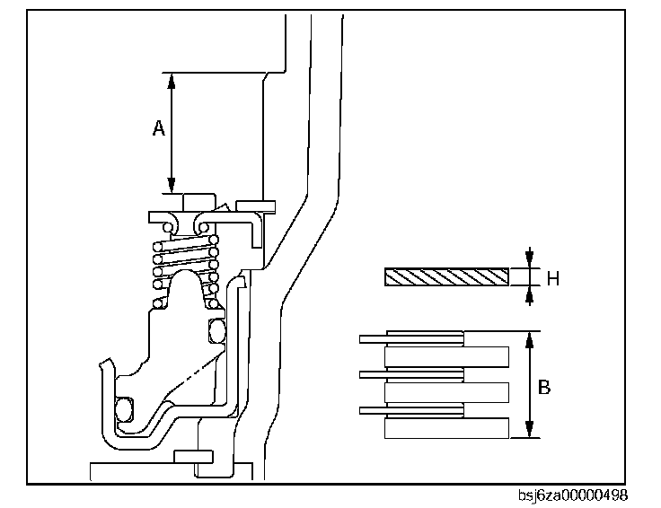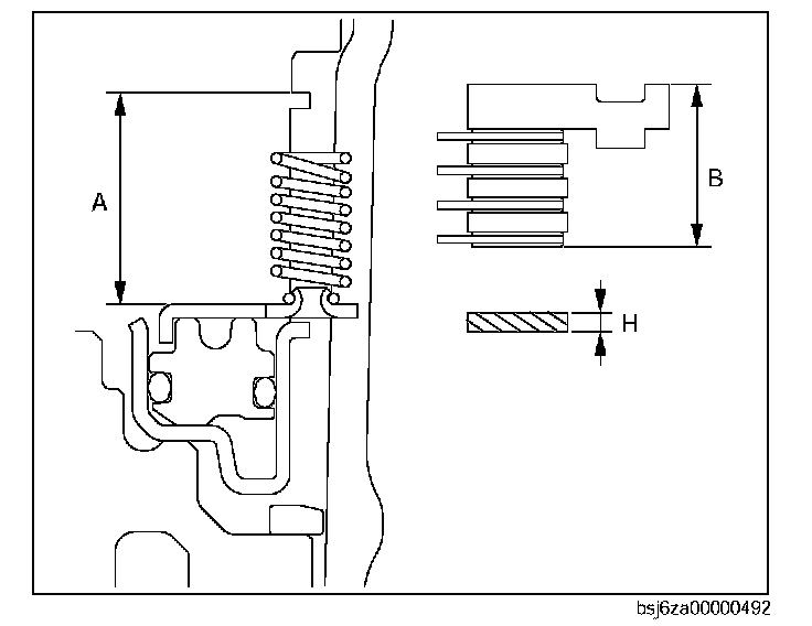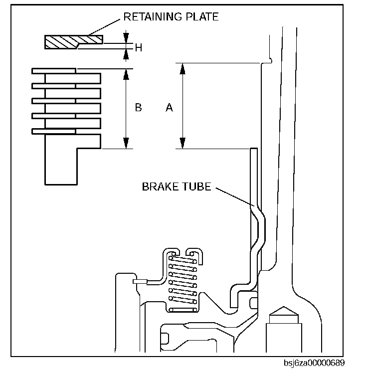 43. Measure the level difference (length A) between the B1 brake piston upper surface and retaining plate contact surface at the both ends across the B1 brake piston diameter using a vernier caliper, and calculate the average value.