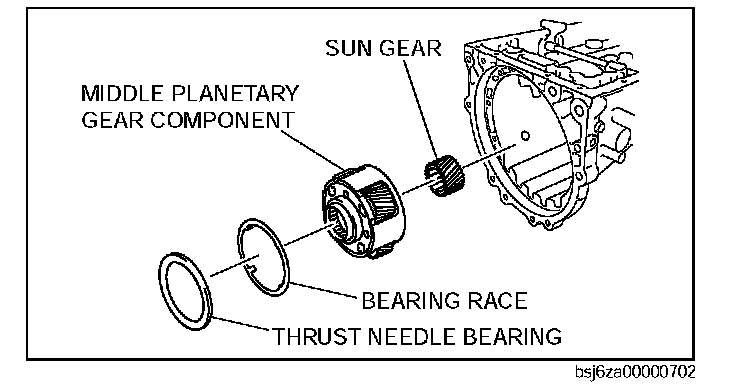 49. Install the bearing race and thrust needle bearing to the middle planetary gear component.