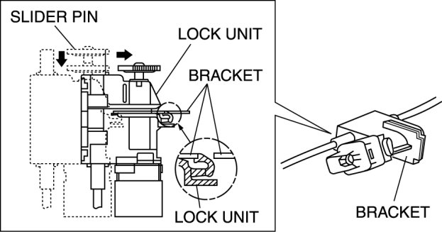 6. With the slider pin pressed, slide the lock unit to fix the lock unit hook into the bracket hole securely as shown in the figure.