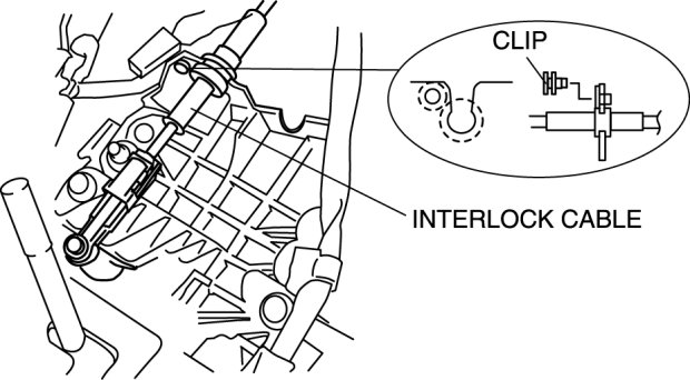 11. Fit the interlock cable in the U-groove in the selector lever base plate, and install the clip.