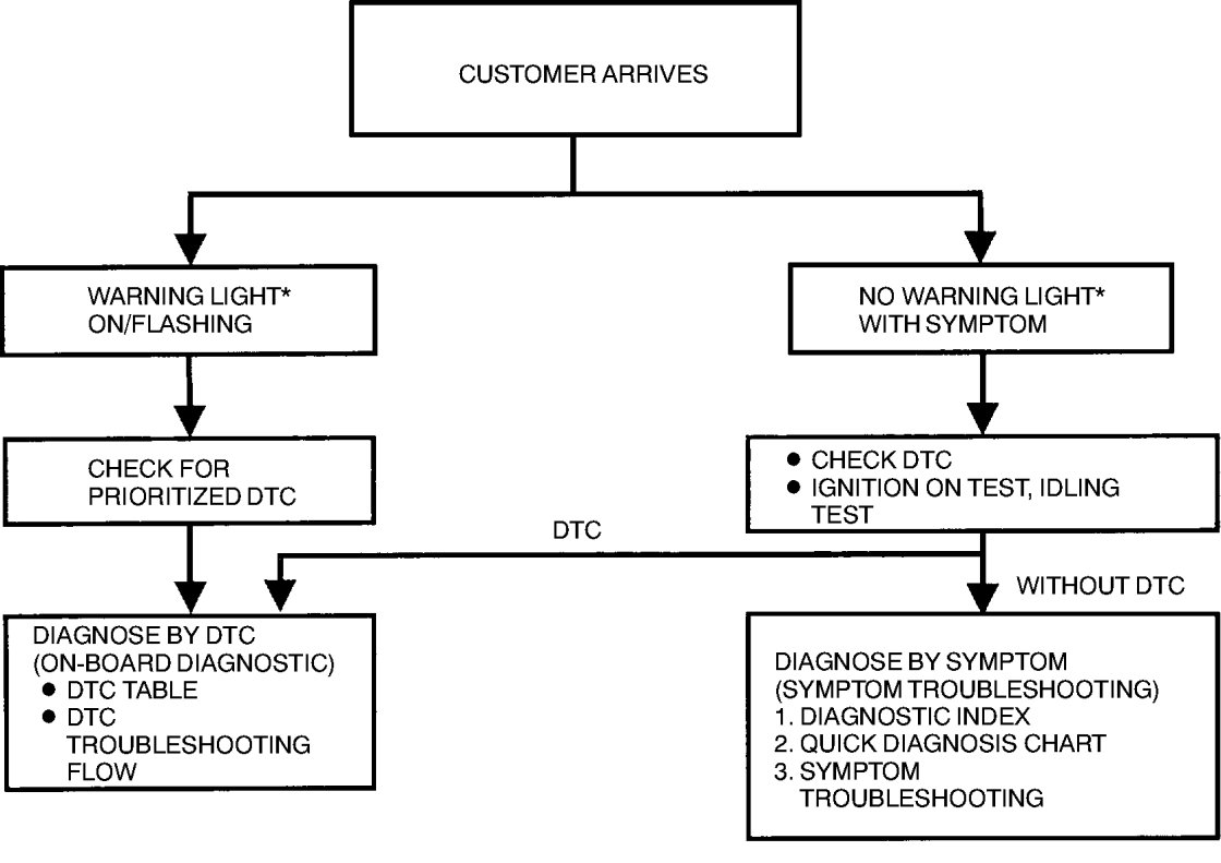 - When the customer reports a vehicle malfunction, inspect the malfunction indicator lamp (MIL) indication, AT warning indicator light flash, and diagnostic trouble code (DTC), then diagnose the malfunction according to following flowchart.