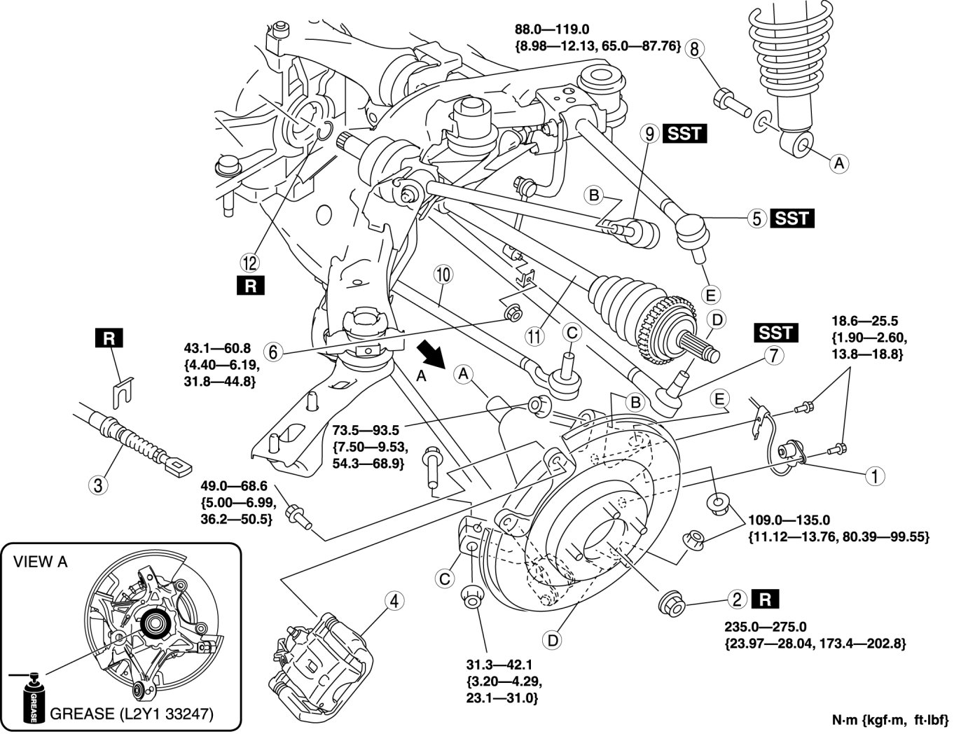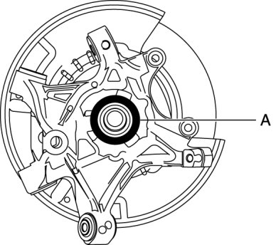 2. Apply grease (L2Y1 33247) to the wheel bearing inner race and rear drive shaft contact surface (Area A in figure).