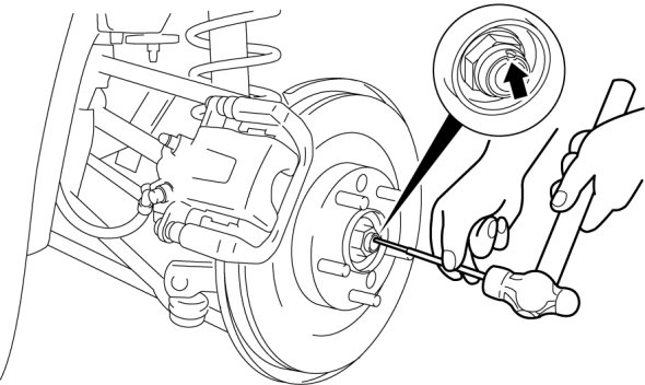 - Performing the following procedures without first removing the ABS wheel-speed sensor may possibly cause an open circuit in the wiring harness if it is pulled by mistake. Before performing the following procedures, remove the ABS wheel-speed sensor (axle side) and fix it to an appropriate place where the sensor will not be pulled by mistake while servicing the vehicle.