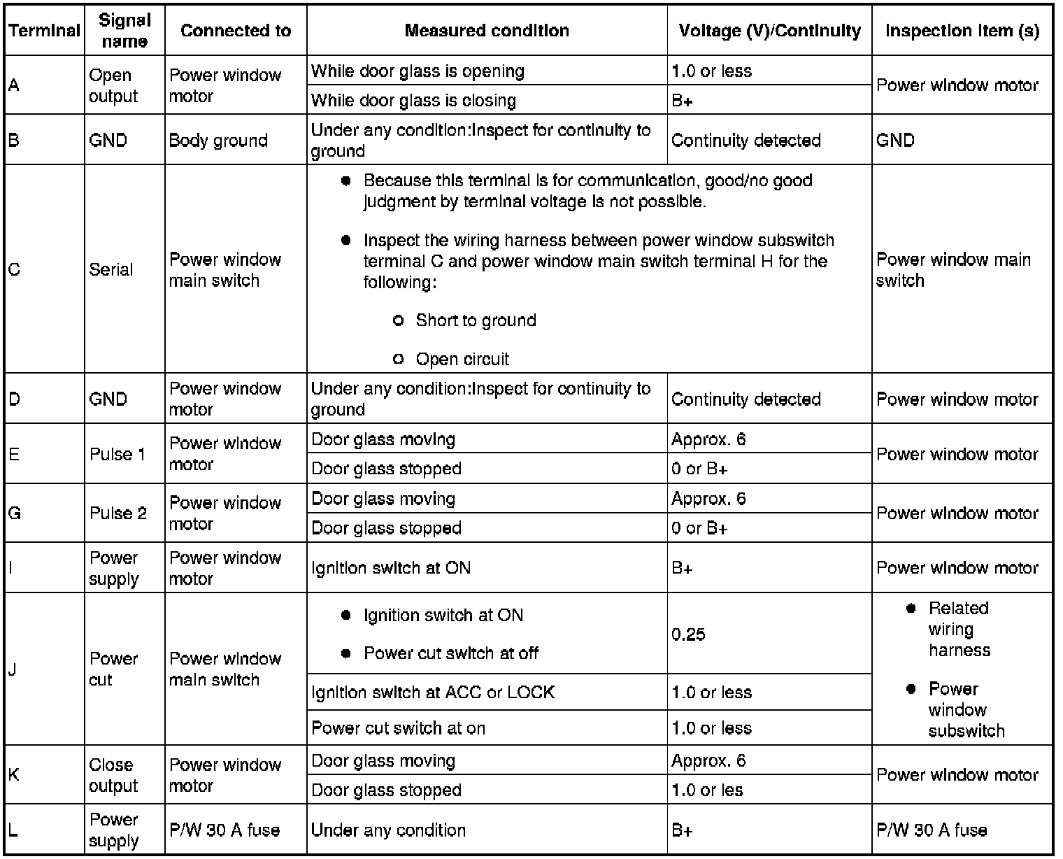 - If the voltage is not as specified in the terminal voltage table, inspect the parts under "Inspection item (s)".