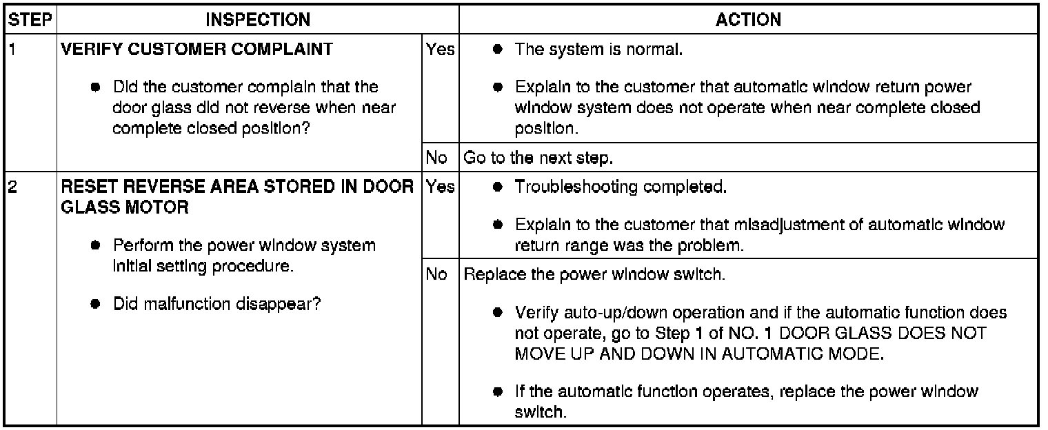 - Perform the following inspection for the power window system component parts of the windows where the door glass does not reverse, even when encountering a foreign object in its path.