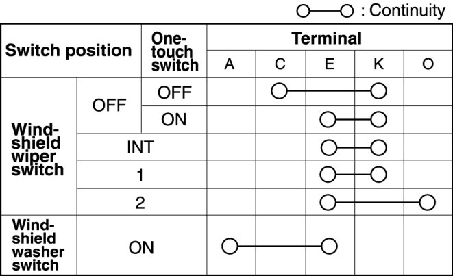 4. Verify that the continuity between the windshield wiper and washer switch is as indicated in the table.
