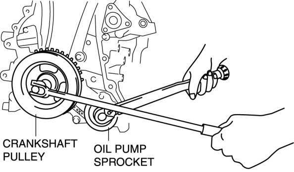 1. Temporarily install the crankshaft pulley and crankshaft pulley lock bolt to the crankshaft, and lock the oil pump against rotation as shown in figure.