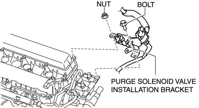 1. Remove the purge solenoid valve installation bracket with the evaporative hose still connected and set it out of the way.