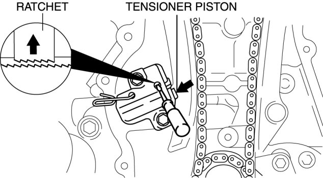 1. Using a thin screwdriver, hold the chain tensioner ratchet lock mechanism away from the ratchet stem.