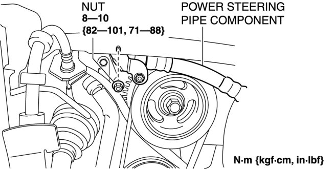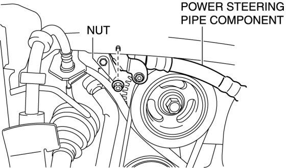 2. Remove the nut shown in the figure and set the power steering pipe component out of the way.