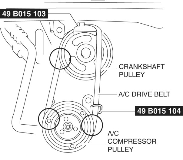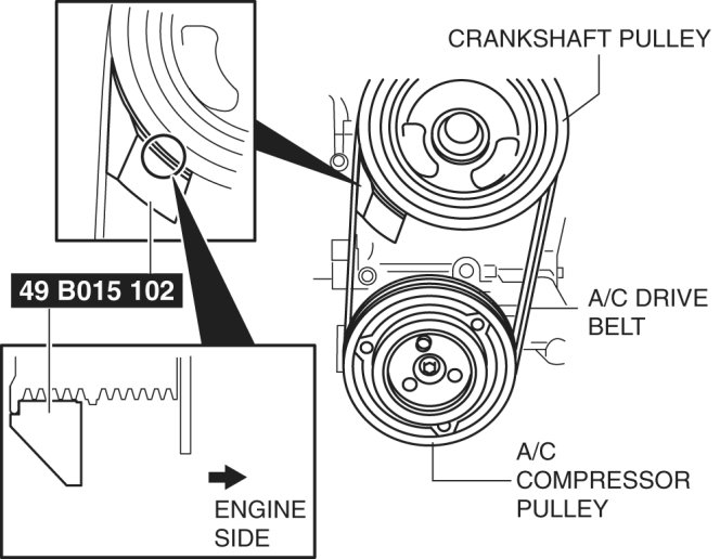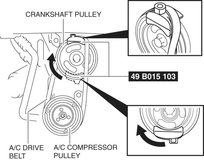 6. Rotate the crankshaft pulley clockwise one time or more to verify that the A/C drive belt is installed correctly.