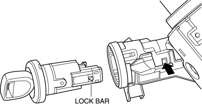 2. Insert a pin from the position indicated by the arrow in the figure, and while pressing the lock bar with the pin, remove the key cylinder from the steering lock component.