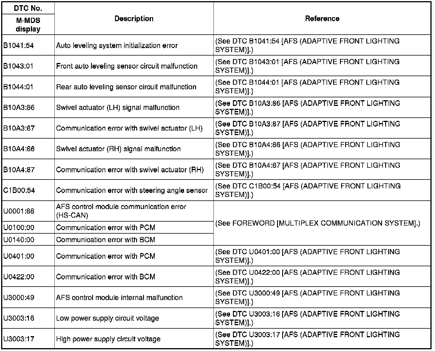 DTC TABLE [AFS (ADAPTIVE FRONT LIGHTING SYSTEM)]