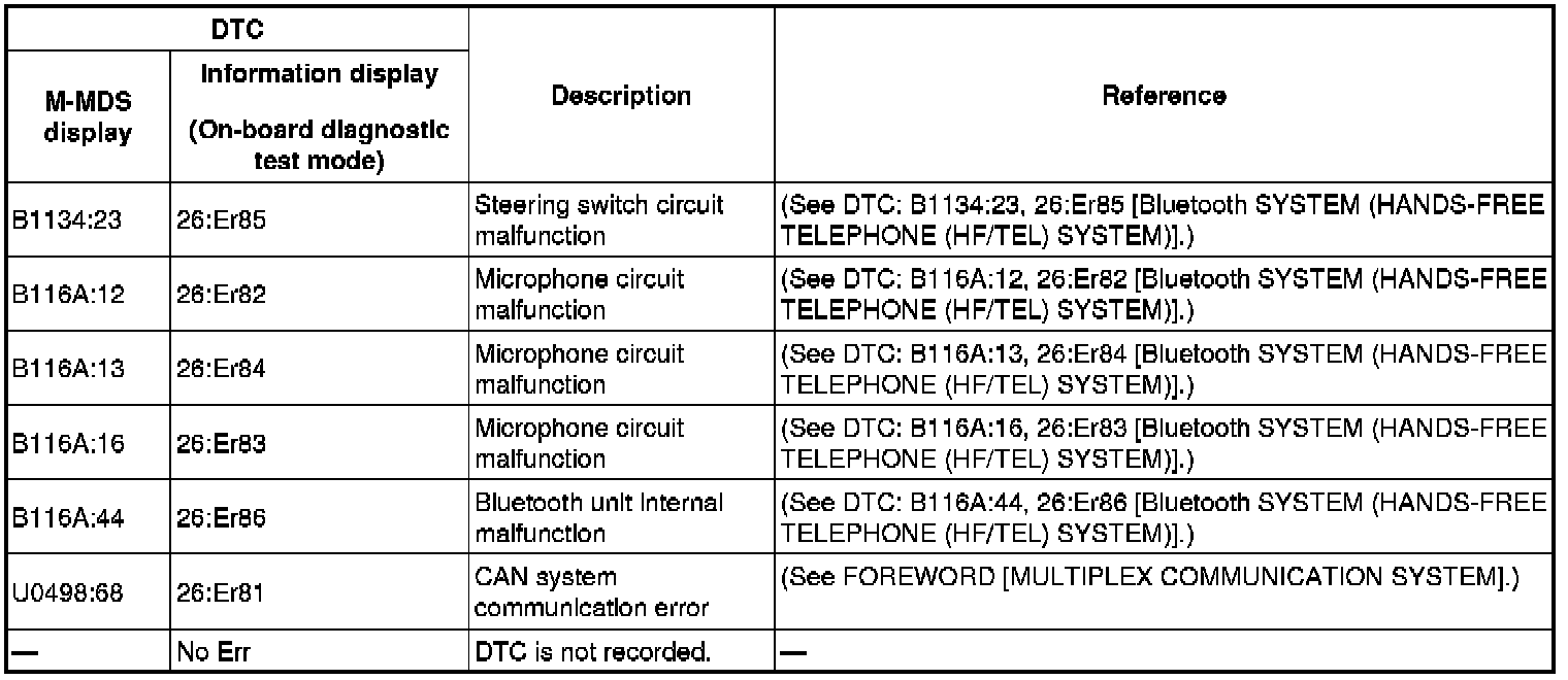 DTC TABLE [Bluetooth SYSTEM (HANDS-FREE TELEPHONE (HF/TEL) SYSTEM)]