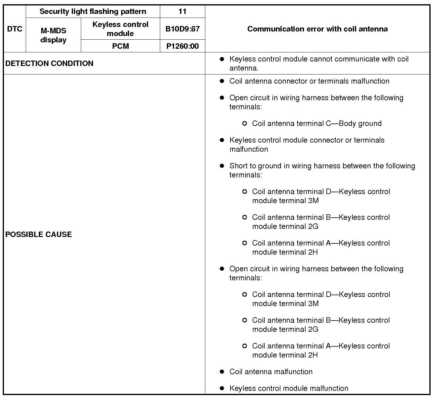 SECURITY LIGHT: 11, DTC: B10D9:87/P1260:00 [IMMOBILIZER SYSTEM (ADVANCED KEYLESS ENTRY AND PUSH BUTTON START SYSTEM)]