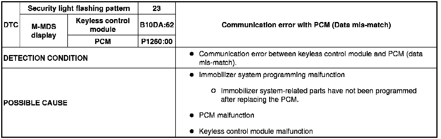 SECURITY LIGHT: 23, DTC: B10DA:62/P1260:00 [IMMOBILIZER SYSTEM (ADVANCED KEYLESS ENTRY AND PUSH BUTTON START SYSTEM)]