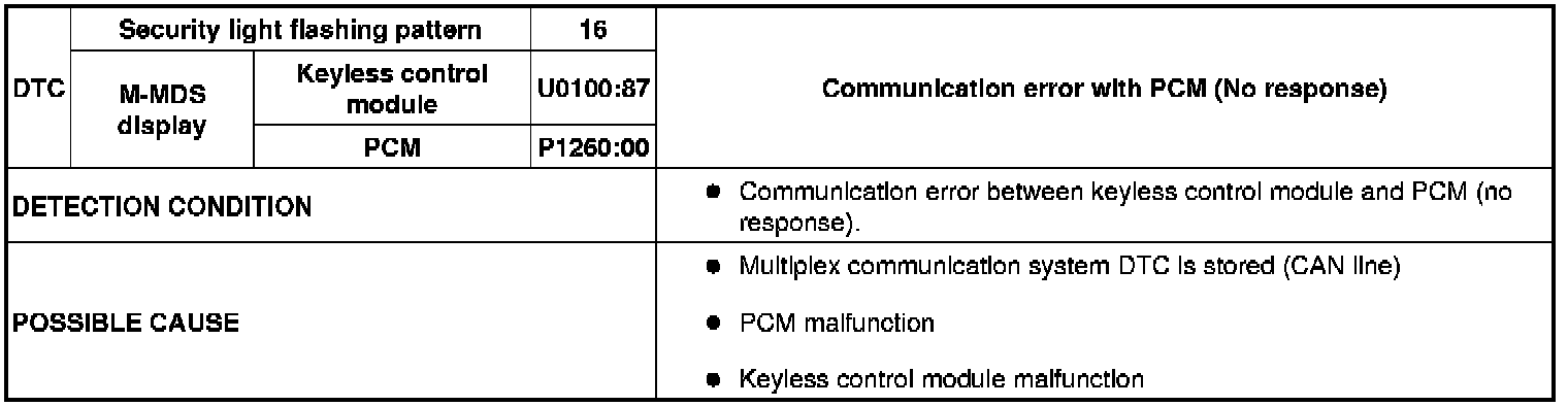 SECURITY LIGHT: 16, DTC: U0100:87/P1260:00 [IMMOBILIZER SYSTEM (ADVANCED KEYLESS ENTRY AND PUSH BUTTON START SYSTEM)]