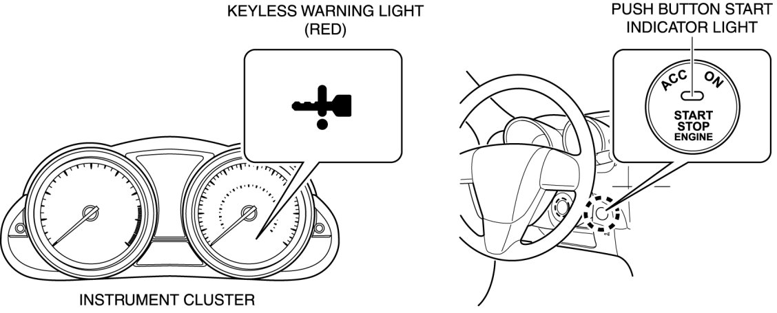 - When the system enters the fail-safe function, the keyless warning light and the push button start indicator light illuminate as follows:
