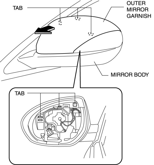 3. Grasp the upper side of the outer mirror garnish and remove it by pulling it in the direction of the arrow.