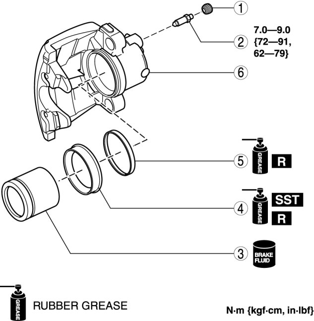 - When blowing compressed air into the caliper body, the piston may pop out and cause injury if not supported at the correct point. Securely support the piston friction surface by hand when blowing compressed air.