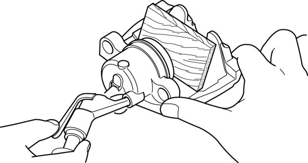 2. Insert a piece of wood between the caliper body and the piston, and while supporting the piston by hand, blow compressed air through the brake hose installation hole.