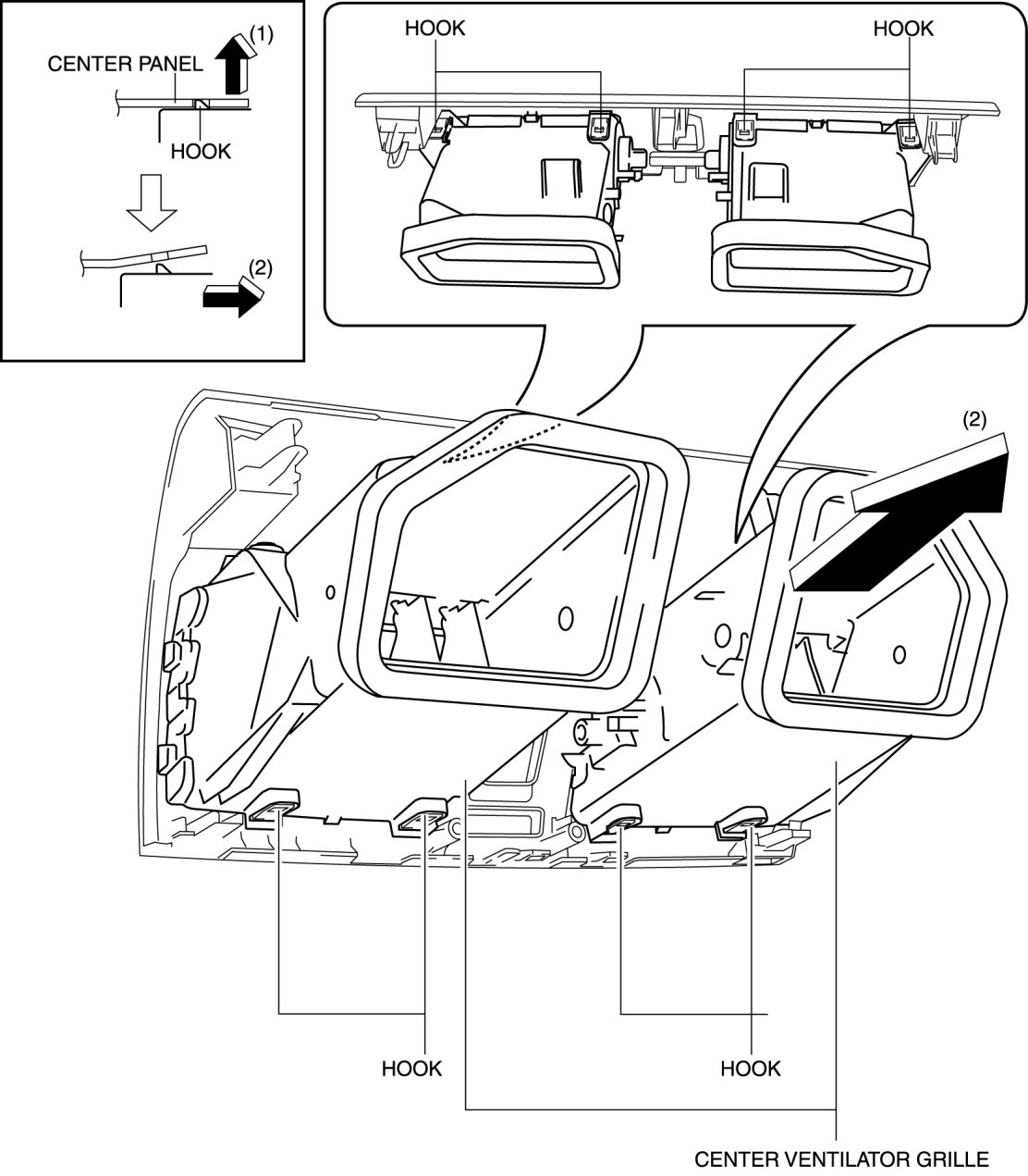 4. Remove the center ventilator grille in the direction of arrow (2) shown in the figure.