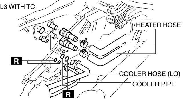 1. While pressing the heater hose into the A/C unit side (1), pinch the quick connector retainer (2), then disconnect the heater hose from the A/C unit (3).