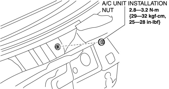 11. Remove the A/C unit installation nut from the engine compartment, then remove the A/C unit.