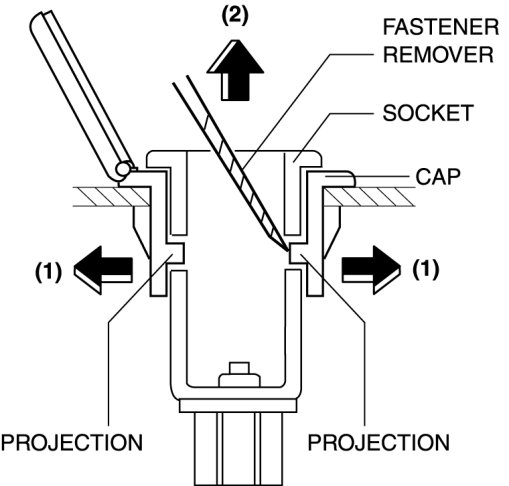 1. Remove the socket in the direction of the arrow (2) shown in the figure while opening the caps in the direction of the arrow (1) using a tape-wrapped fastener remover.