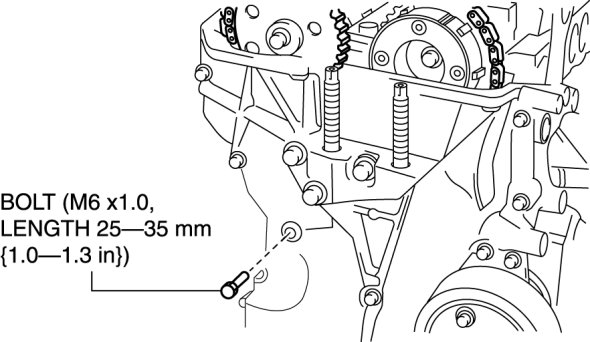 35. Remove the installation bolt for the engine front cover upper blind plug (M6 X 1.0 length 25-35mm {1.0-1.3 in}), and apply tension to the timing chain.