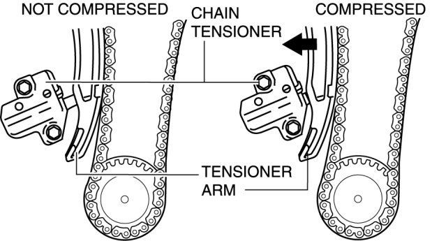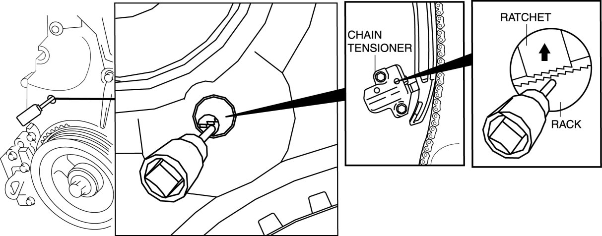 - The chain tensioner rack is compressed using the chain tension generated by applying force to the exhaust camshaft in the direction of the engine rotation.