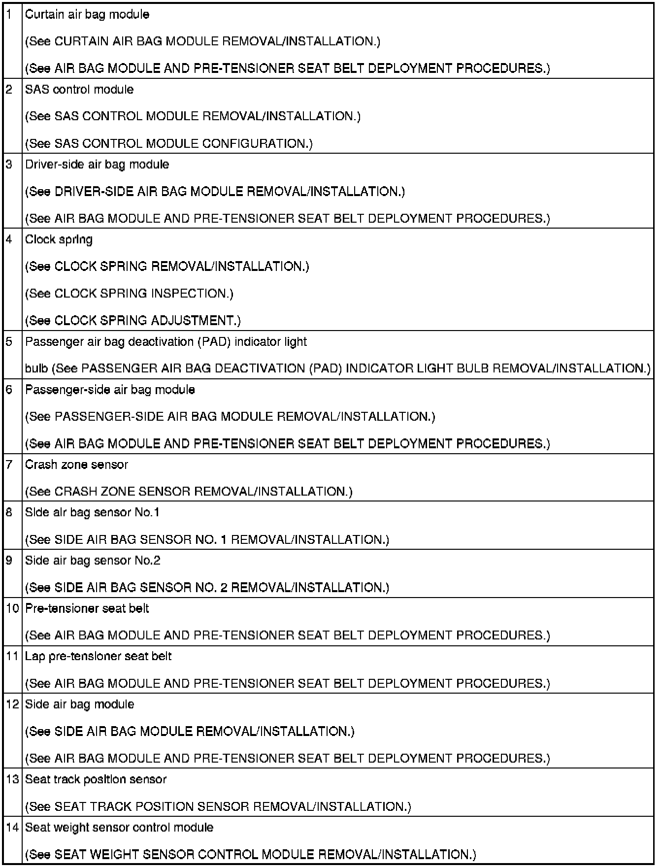 AIR BAG SYSTEM LOCATION INDEX