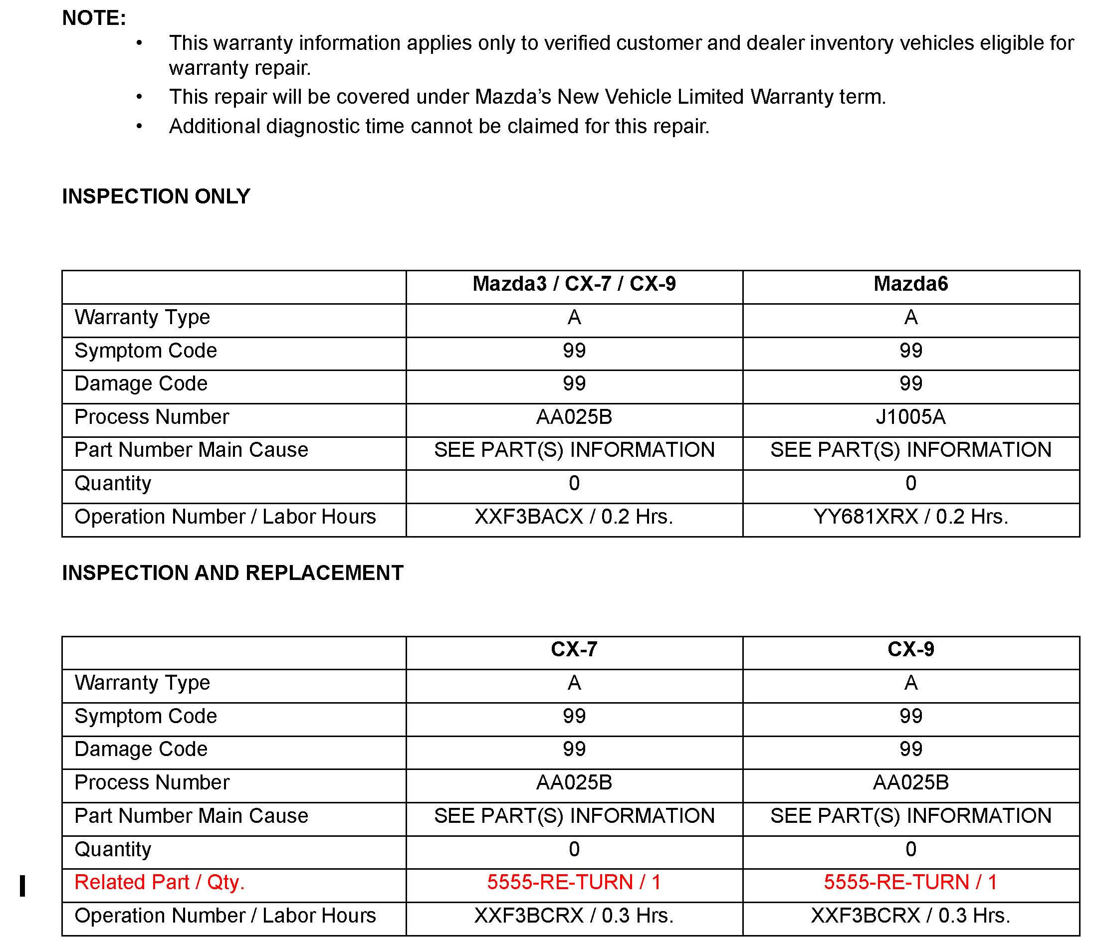 ^ UNDER THE MAZDA SERVICE PROGRAM (MSP3O), ALL CURRENT DEALER INVENTORY AND RETAILED VEHICLES FOUND TO BE WITHIN THE ABOVE VIN AND PRODUCTION DATES RANGES MUST BE REPAIRED ACCORDING TO THE INSTRUCTIONS CONTAINED IN THIS SERVICE BULLETIN.