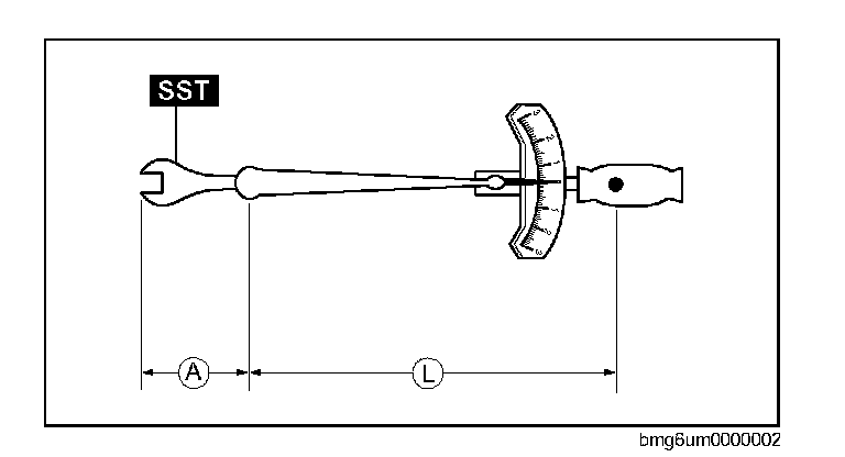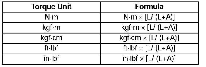 ^ When using a torque wrench-SST or equivalent combination, the written torque must be recalculated due to the extra length that the SST or equivalent adds to the torque wrench. Recalculate the torque by using the following formulas. Choose the formula that applies to you.