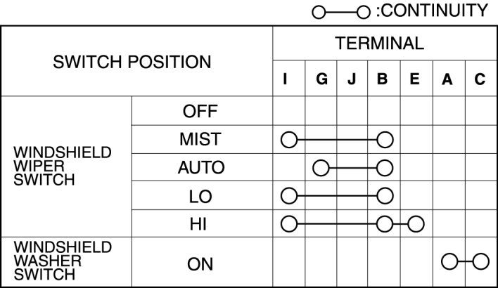 3. Verify that the resistance and continuity between the windshield wiper and washer switch terminals as indicated in the table.