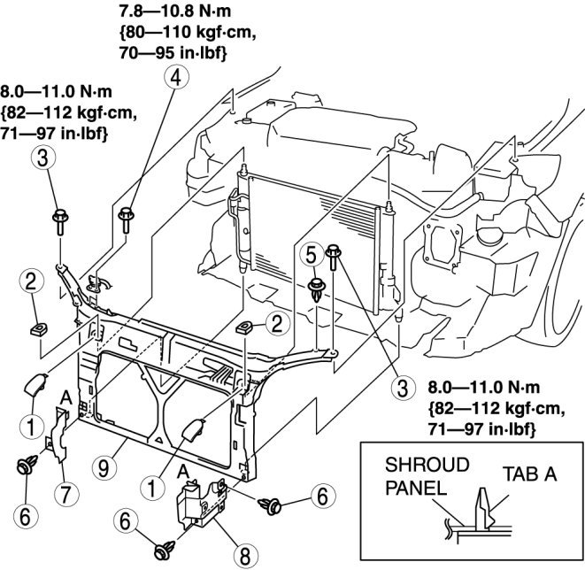 - Because the shroud panel is installed to the front bumper reinforcement, support the shroud panel using a jack before removing the front bumper reinforcement so as not to apply excessive force to the shroud panel.