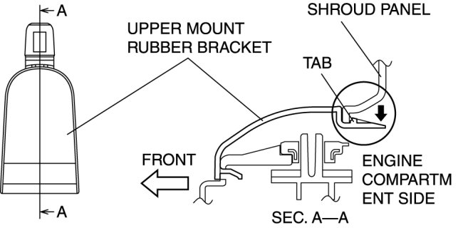 1. Remove the upper mount rubber bracket while pressing down the upper mount rubber bracket tab in the direction of the arrow.