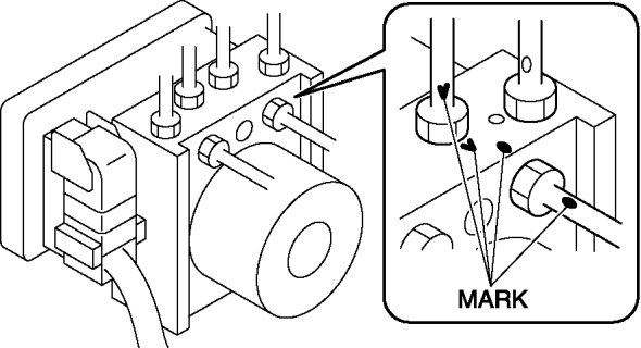 1. Align the marks made before removal and install the brake pipe into the DSC HU/CM referring to the figure.