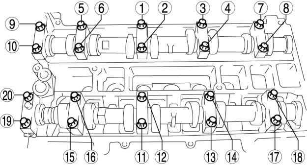 1. Loosen the camshaft cap bolts in 2-3 steps in the order shown in the figure.