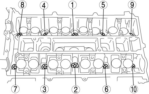 1. Loosen the cylinder head bolts in 2-3 steps in the order shown in the figure.