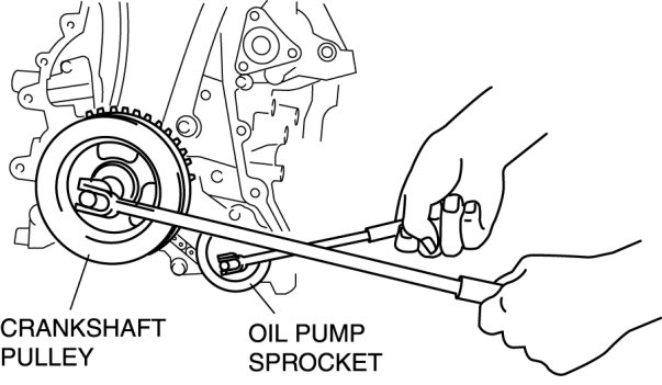 1. Temporarily install the crankshaft pulley and crankshaft pulley lock bolt to the crankshaft, and lock the oil pump against rotation as shown in figure.