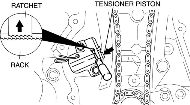 3. Remove the retaining wire or paper clip from the auto tensioner to apply tension to the timing chain.