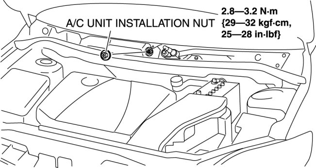 7. Remove the A/C unit installation nut from the engine compartment, then remove the A/C unit.