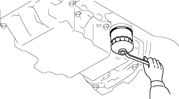3. Loosen the filter cover for 1 turn using a commercially available, cup-type oil filter wrench (74 mm {2.9 in} diameter, 14 sided).
