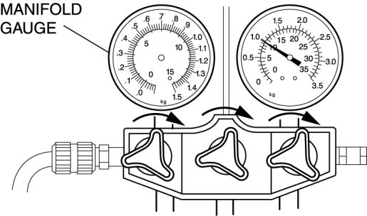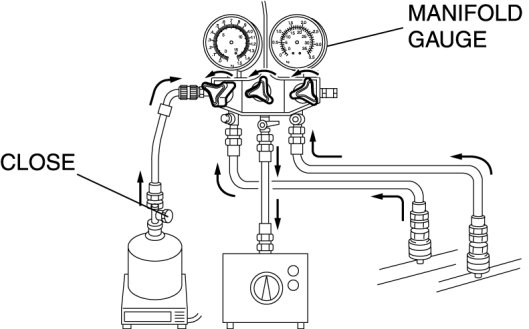 - Close the manifold gauge valve immediately after stopping the vacuum pump. If the valve is left open, the vacuum pump oil will flow back into the refrigeration cycle and cause a decrease in the efficiency of the air conditioner.